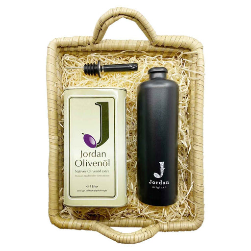 Jordan OlivenölJordan Olivenöl - Füllkorb "Seegras" - Groß - SET 2 - Jordan Natives Olivenöl Extra 1L Kanister + Keramikflasche + 3 Kuratierte Jordan Produkte - 4...
