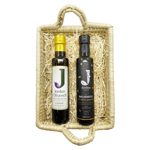 Jordan OlivenölJordan Olivenöl - Füllkorb "Seegras" - Klein - SET 2 - Jordan Olivenöl 0,25L + Jordan Original Balsamico 3 Jahre gereift 0,25L - 30cm x 22cm x 11 c...